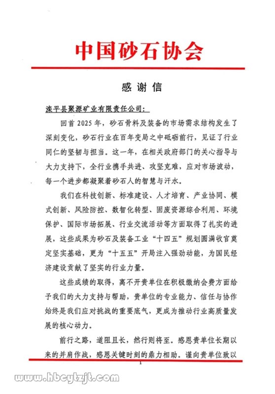近日,河北創(chuàng)遠(yuǎn)投資集團(tuán)旗下灤平縣聚源礦業(yè)有限責(zé)任公司收到中國(guó)砂石協(xié)會(huì)發(fā)來(lái)的感謝信。信中對(duì)聚源礦業(yè)的專(zhuān)業(yè)能力、信任與協(xié)作表示高度認(rèn)可,感謝聚源礦業(yè)長(zhǎng)期以來(lái)的并肩作戰(zhàn)和關(guān)鍵時(shí)刻的鼎力相助。